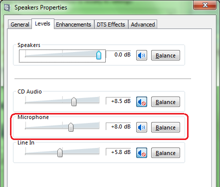 | • | select the "Levels" tab: if the driver implements microphone boost you should see something similar: |